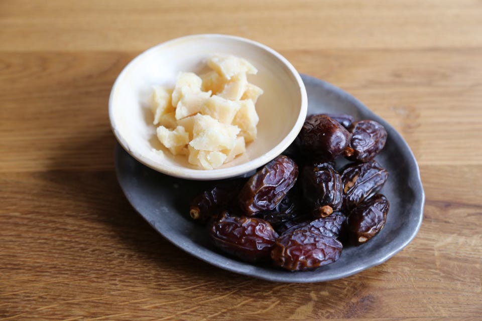 For something simple, I threw together a plate of medjool dates (my favorite) and little jagged chunks of Parmigiano. It was delicious, and we ended up stuffing the cheese into the dates after removing the pit.