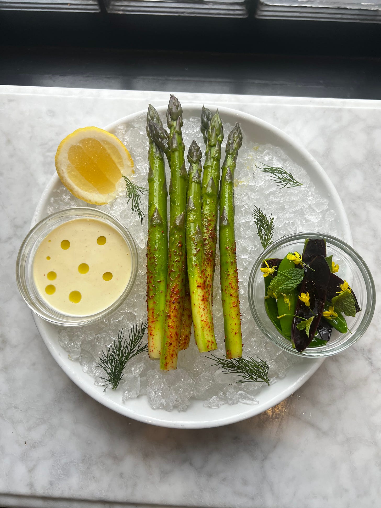 Scattered among the plates of fresh crudo and platters of raw oysters, it was a refined vegetable dish that stole the show. Blanched asparagus was stacked and served over ice, in the language of raw bar, alongside a dish of sugar snap peas (also blanched) and a delicate aioli for dipping. It was an inventive crudité and truth be told, my favorite dish of the night.