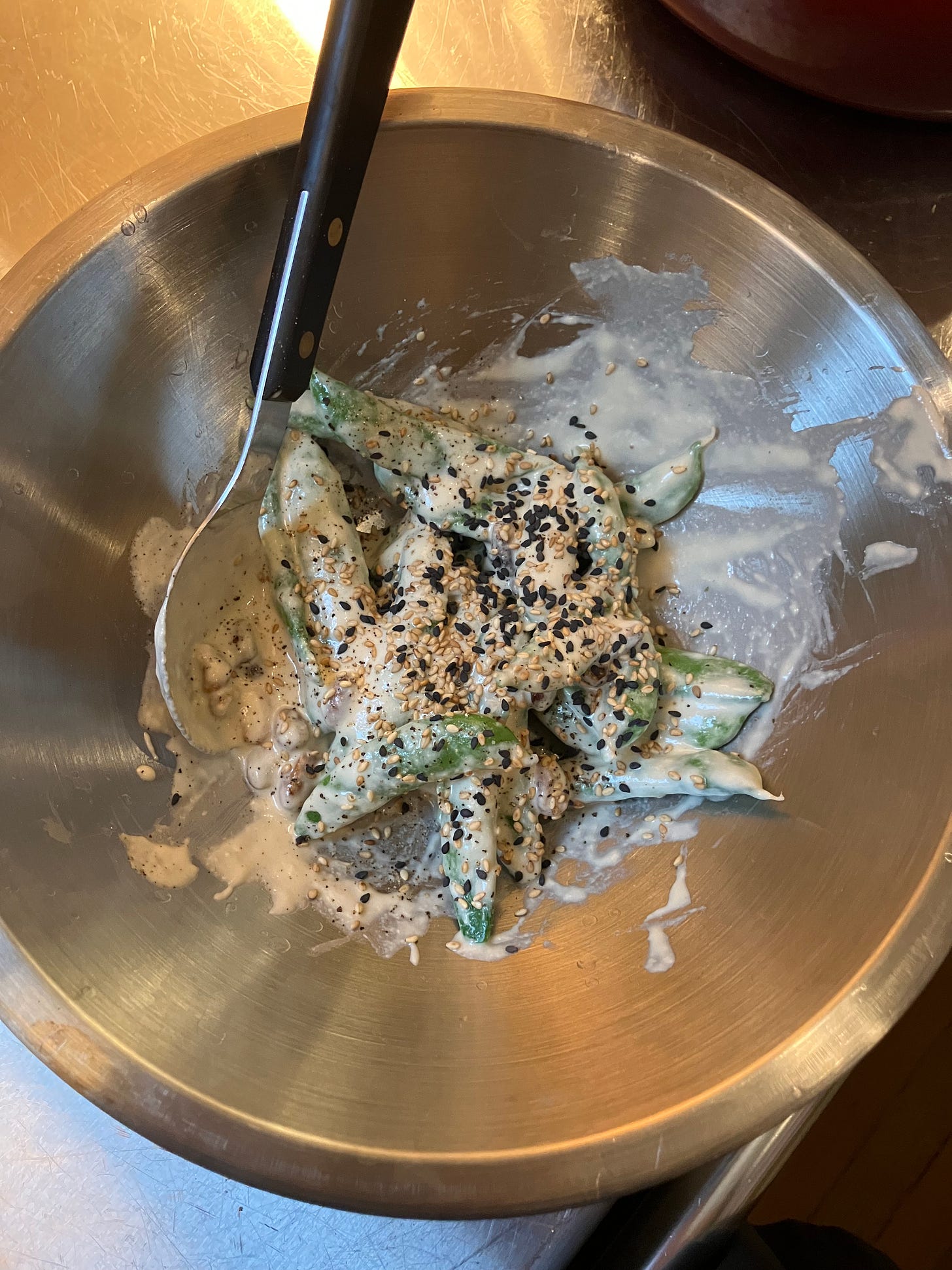 And in the evening, I tossed the peas into a mixing bowl where they were tossed and coated with the sauce before a purely aesthetic addition of black and white sesame seeds.