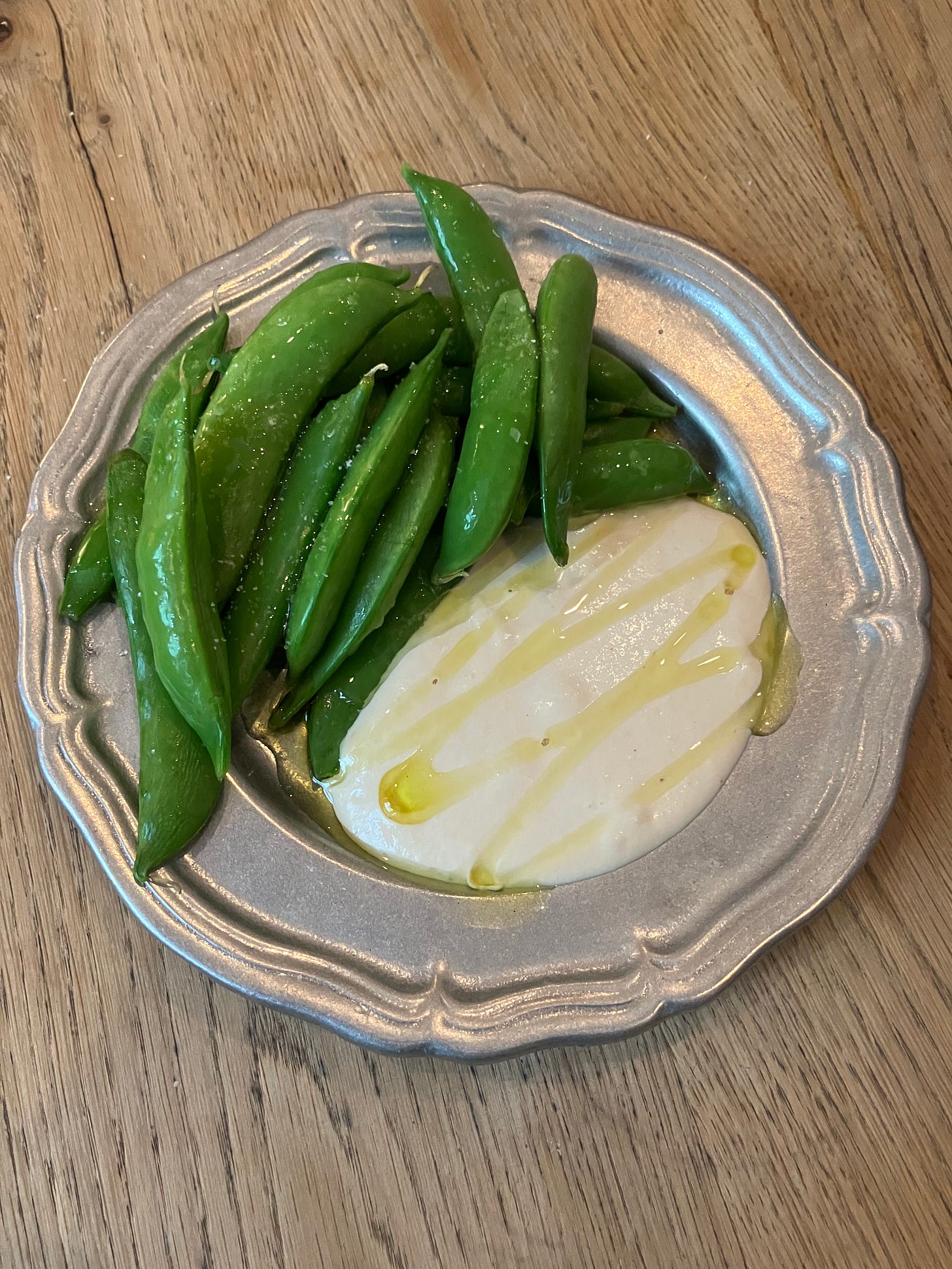 As a midday snack I served a jumble of seasoned sugar snaps aside a spoonful of sauce, anointed with more olive oil.