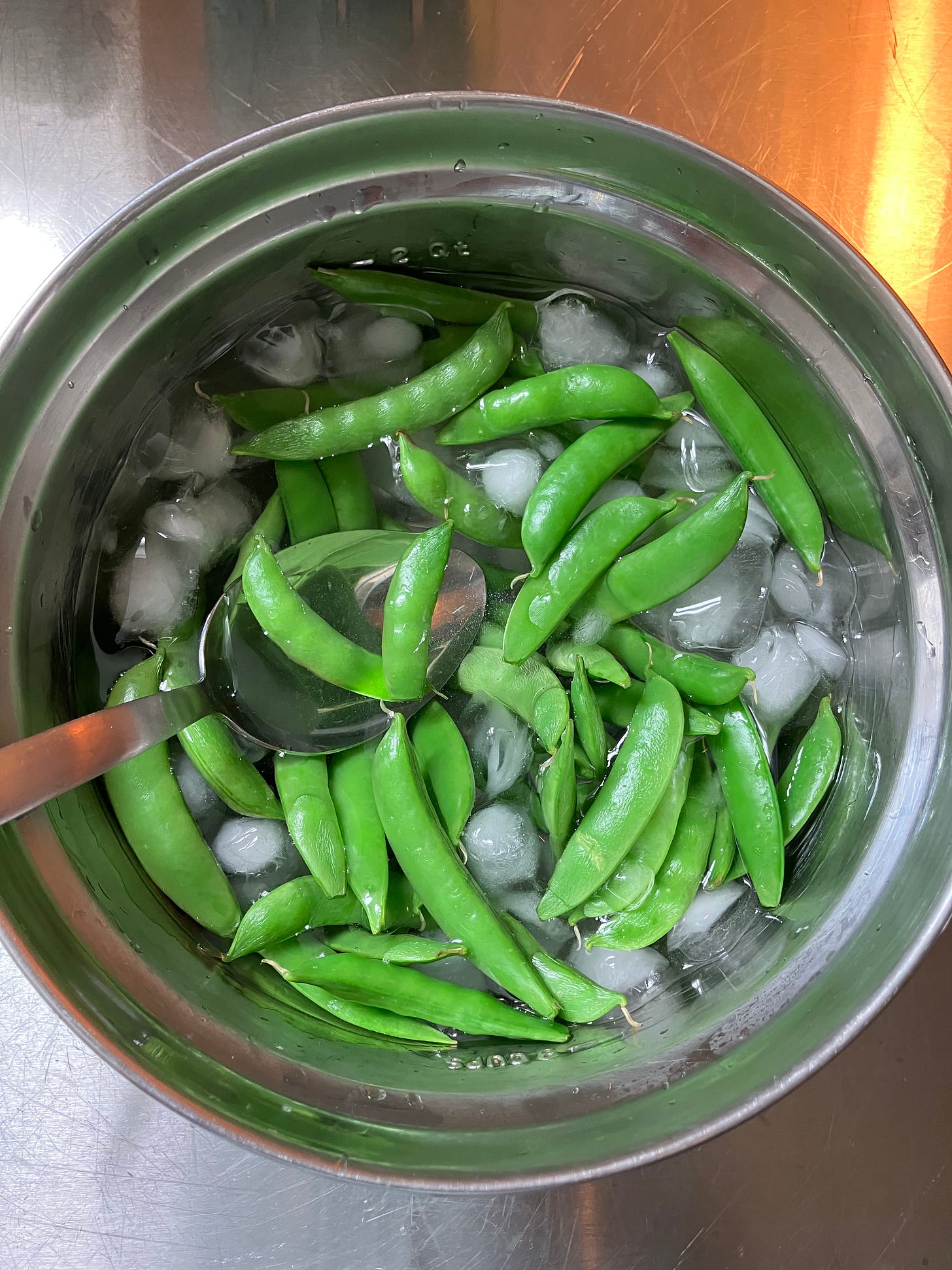 I started with a quick blanch of my sugar snap peas - 30 seconds in boiling water, followed by a plunge into an icy bath to halt the cooking and set their color. EASY.
